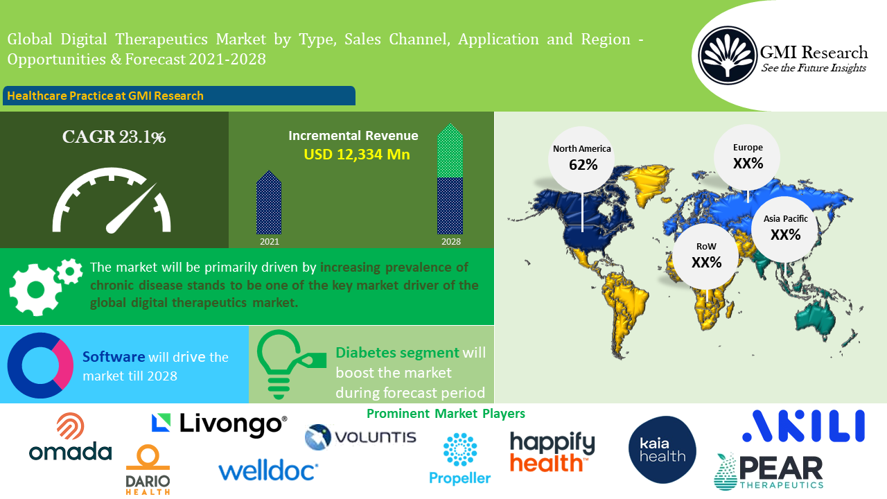 Various key players operating in the market include DarioHealth Corp., Omada Health, Inc., Livongo, Welldoc’s BlueStar, Happify Health, Voluntis, Propeller Health, Kaia Health Software Inc., Pear Therapeutics, Inc., and Akili Interactive Labs, Inc.