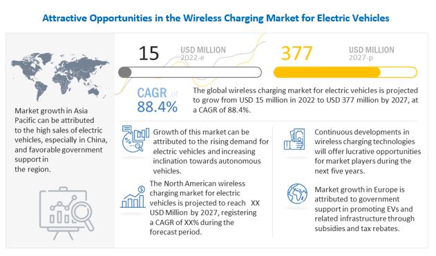 The report “Wireless Charging Market for Electric Vehicles by Power Supply Range (3-50 KW), Application (Home & Commercial), Distribution Channel (Aftermarket & OE), Component, Charging System, Propulsion, Vehicle Type & Region – Global Forecast to 2027” The global wireless charging market for electric vehicles is projected to grow from USD 15 million in 2022 to USD 377 million by 2027, at a CAGR of 88.4%. Factors such as rising sales of electric vehicles around the world, along with the increasing inclination towards autonomous driving technology by automotive OEMs will boost the demand for the wireless charging market for electric vehicles. Increasing investments for smart roads in several countries such as the US, Germany, and Italy, among others, in conjunction with increasing governmental support for wireless charging will create new opportunities for this market.