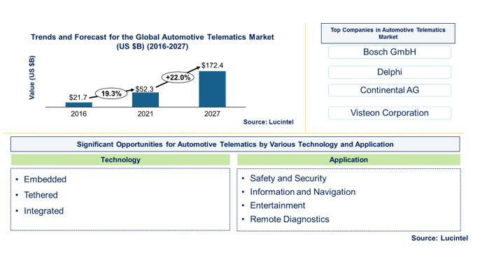 Lucintel’s latest market report analyzed that automotive telematics provides attractive opportunities in the embedded, tethered, and integrated segments. The automotive telematics market is expected to reach $172.4 billion by 2027 with a CAGR of 22%. In this market, embedded is the largest segment by technology type. Introduction of autonomous vehicles, and transformation of non-connected cars into connected cars provides strategic growth path in this market.