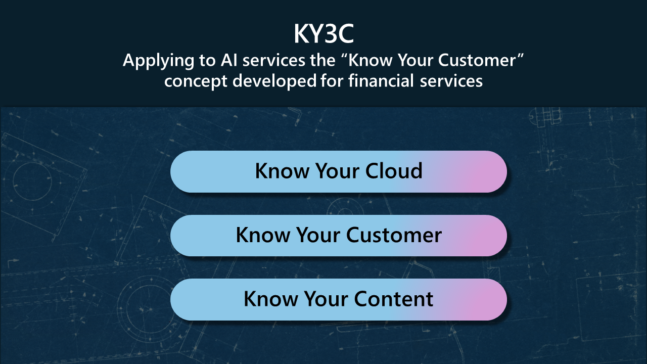 In doing so, this blueprint builds in part on a principle developed in recent decades in banking to protect against money laundering and criminal or terrorist use of financial services. The “Know Your Customer” – or KYC – principle requires that financial institutions verify customer identities, establish risk profiles, and monitor transactions to help detect suspicious activity. It would make sense to take this principle and apply a KY3C approach that creates in the AI context certain obligations to know one’s cloud, one’s customers, and one’s content.